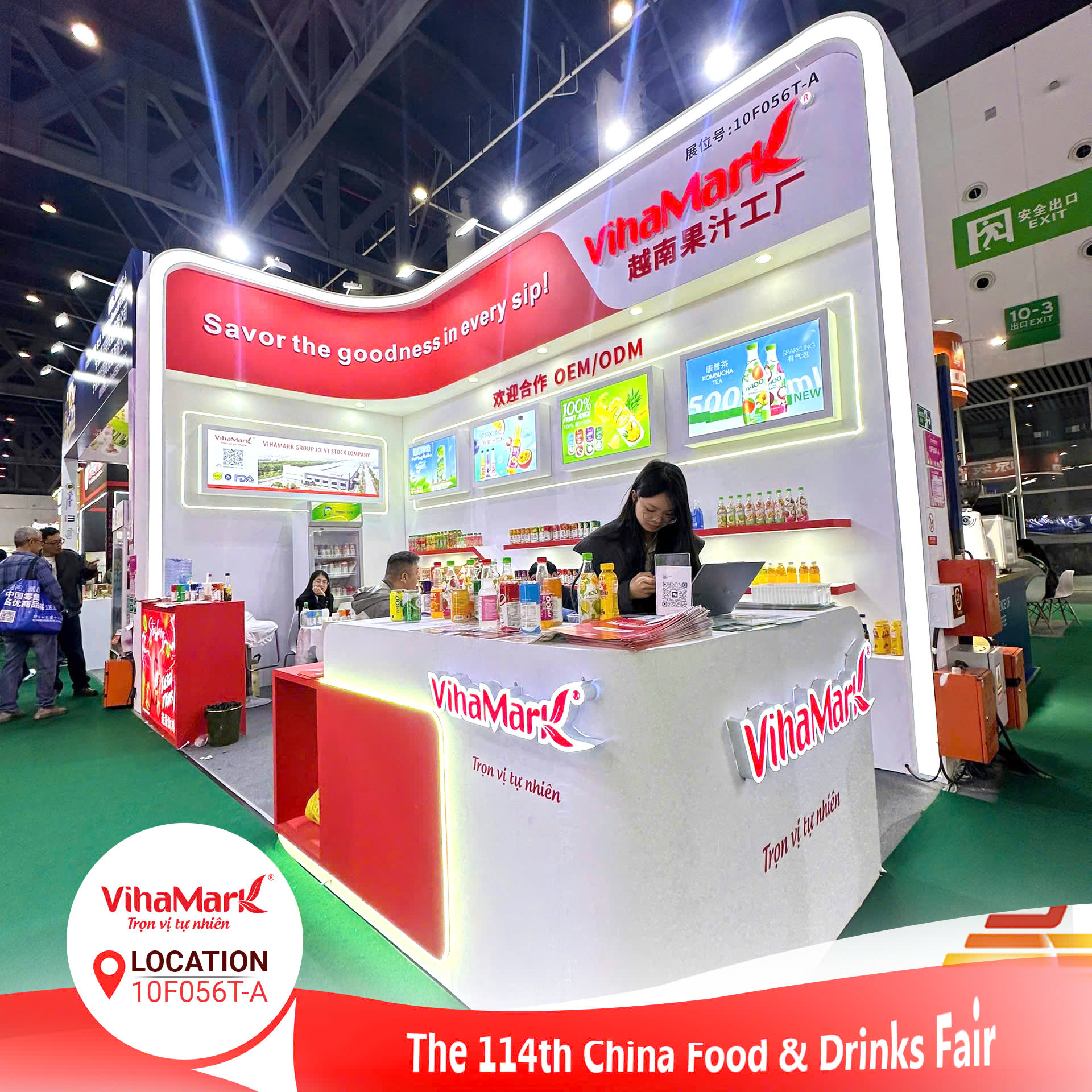 Ngay từ ngày đầu tiên, gian hàng VihaMark đã thu hút đông đảo khách tham quan, nhà phân phối và chuyên gia từ Trung Quốc và nhiều quốc gia khác. Không chỉ giới thiệu những sản phẩm nổi bật như nước ép trái cây tự nhiên, dòng sản phẩm NFC (Not From Concentrate), trà thảo mộc và nước giải khát có gas, VihaMark còn đem đến thông điệp rõ ràng: “Tinh hoa Việt Nam – Chất lượng quốc tế.”